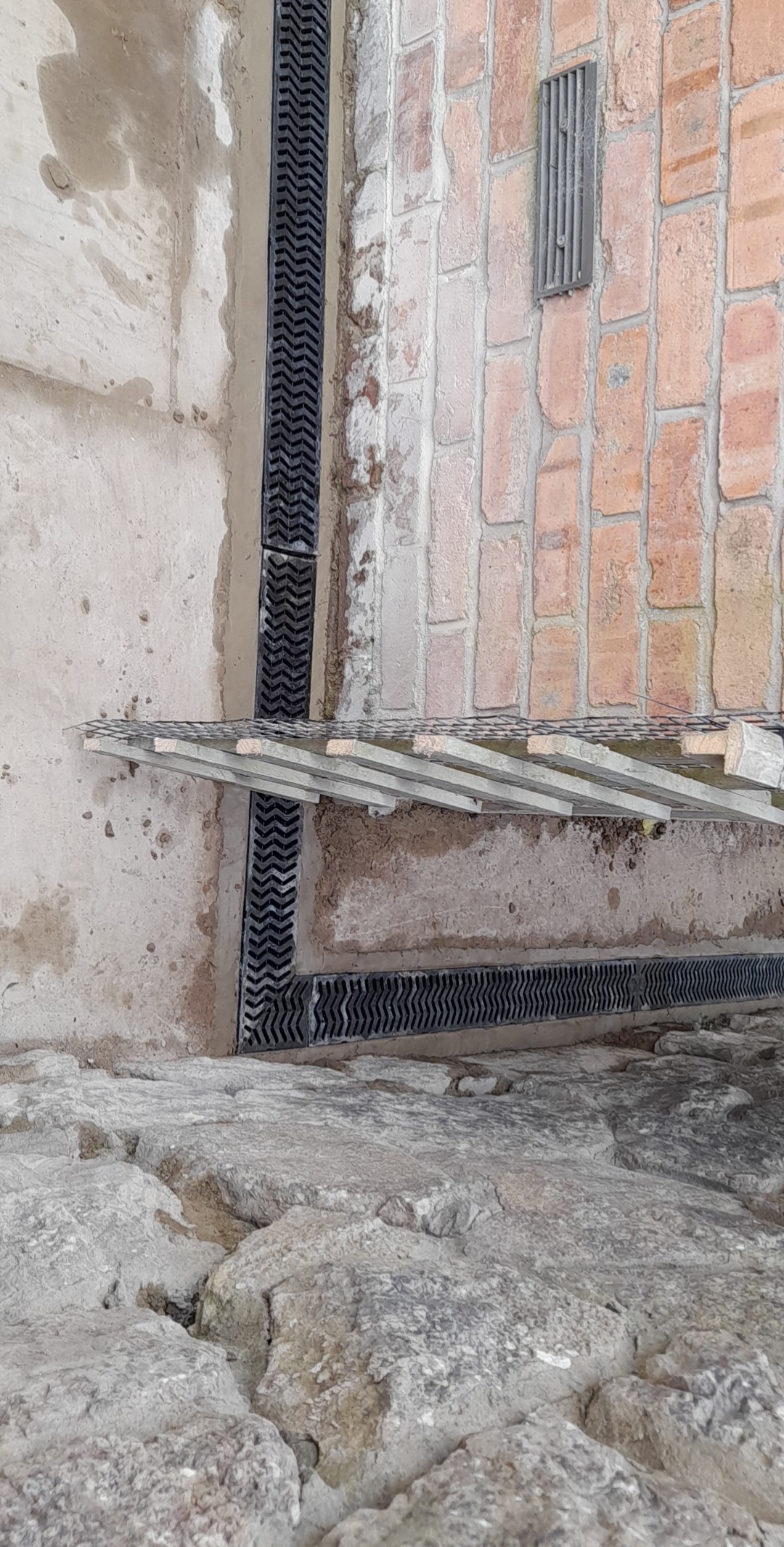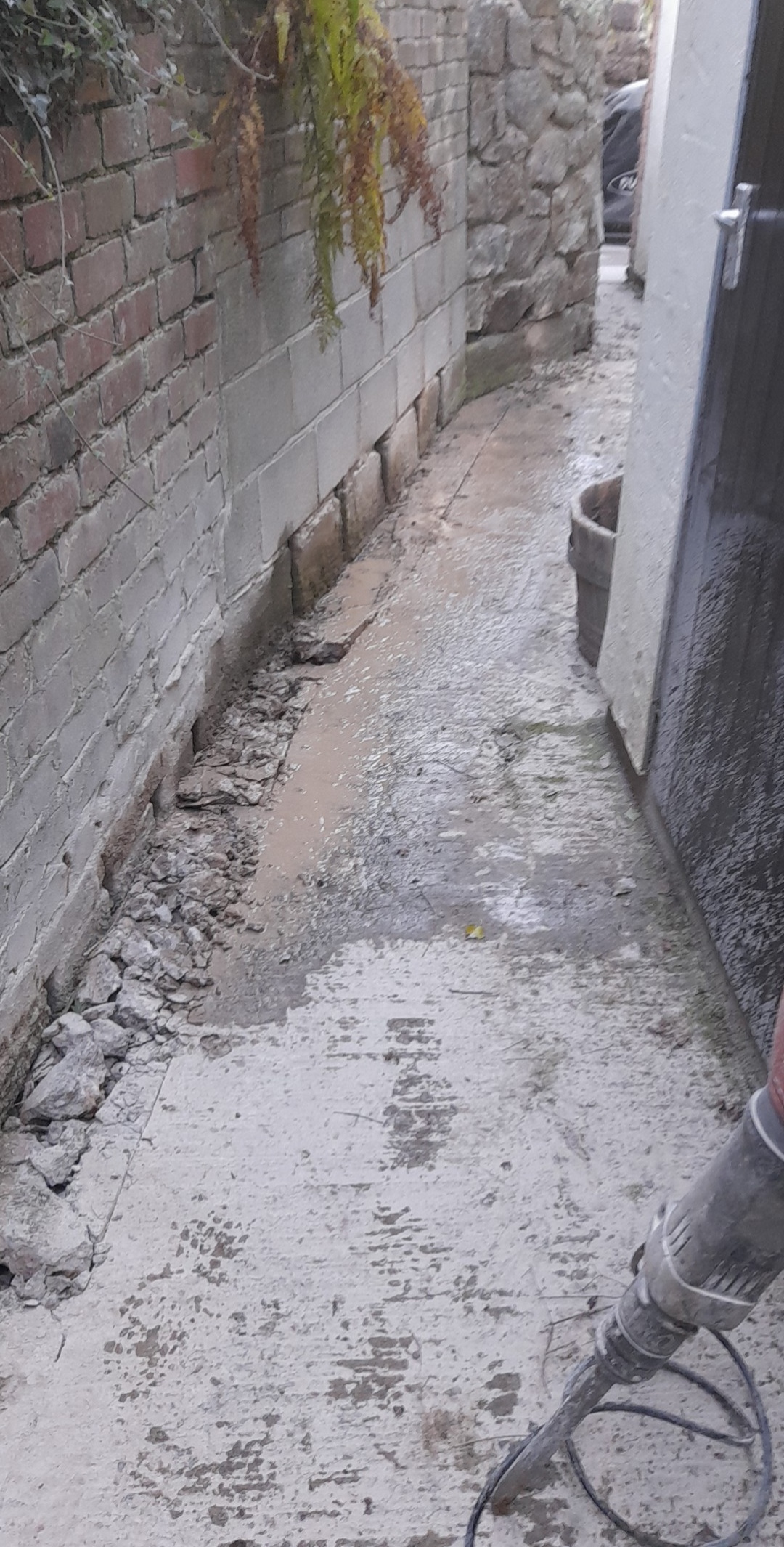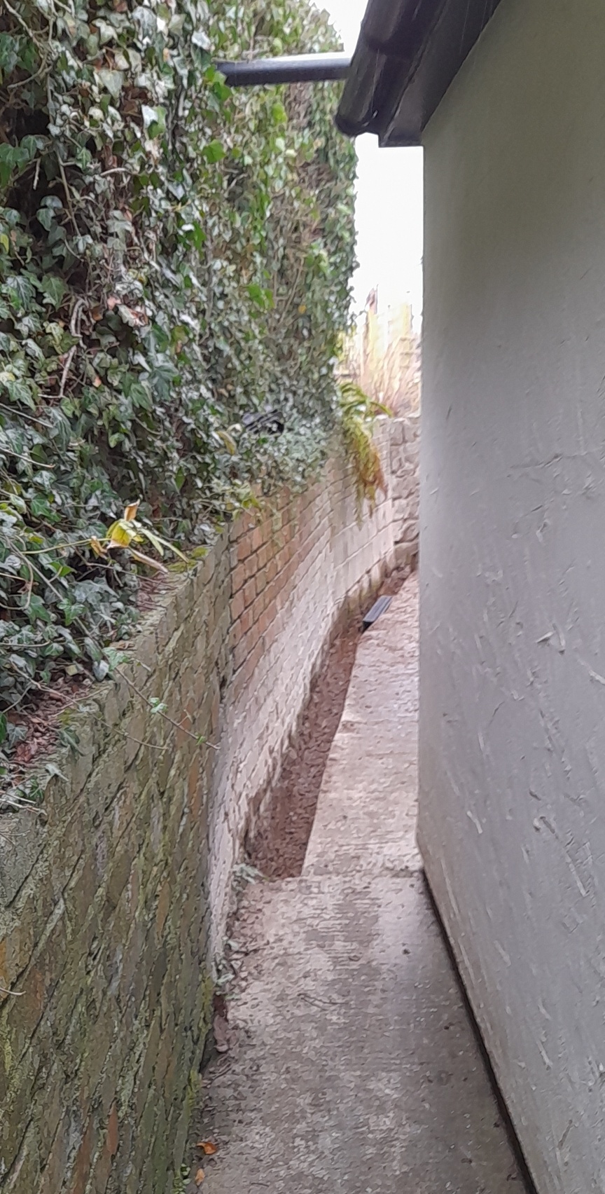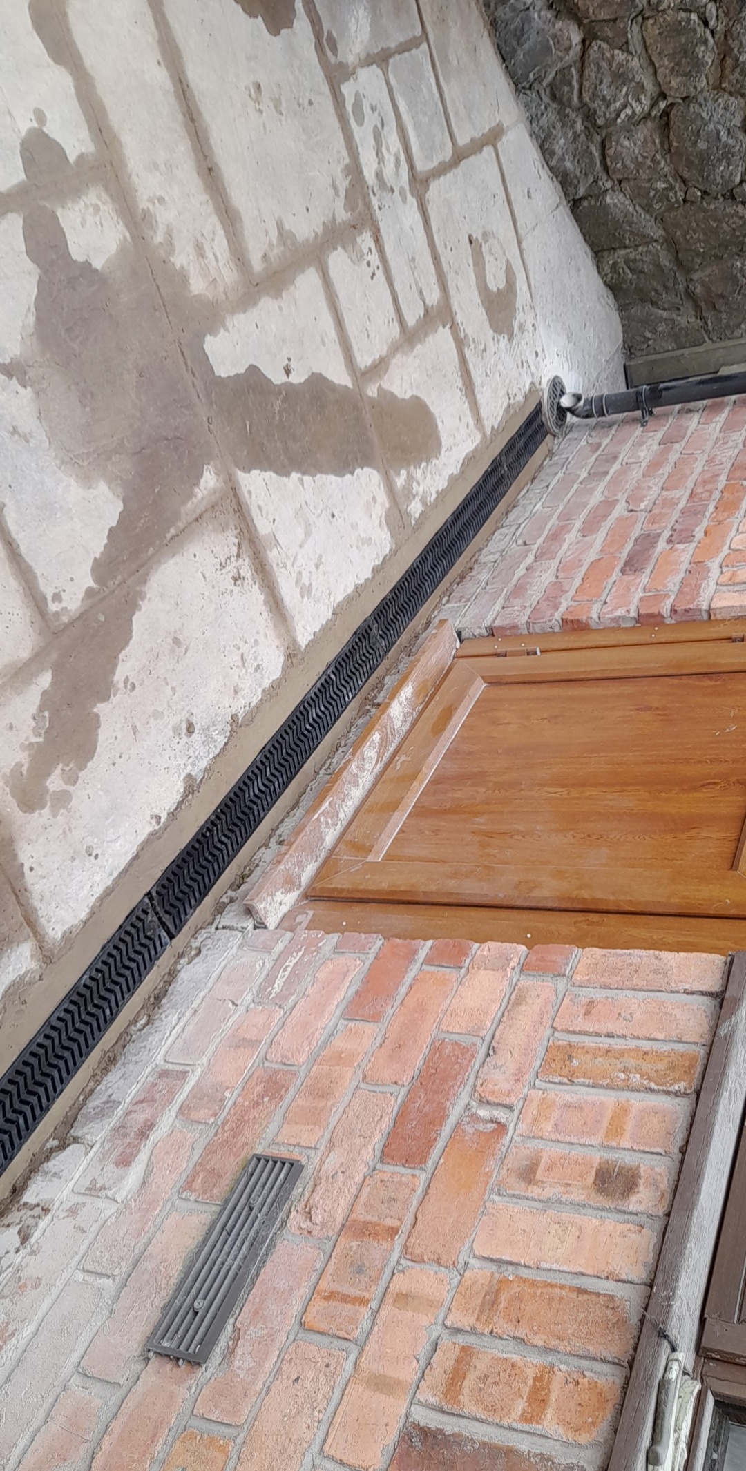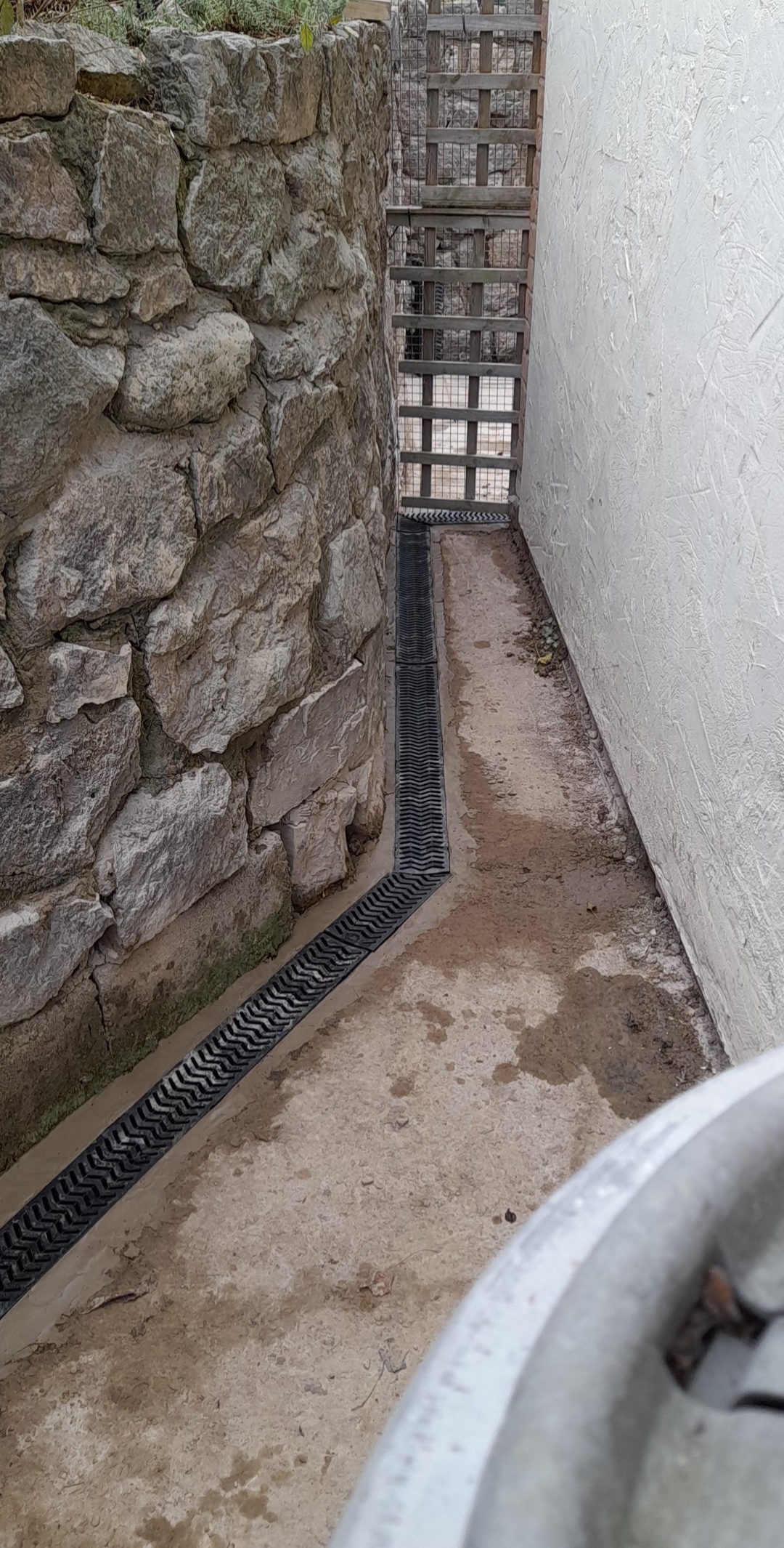 We fitted aco drains around the property to take any excess rain water away. Also when water builds up against the house it can cause damp issues. We connected the outlet to the mains to take all the water and no puddles can build up around the house